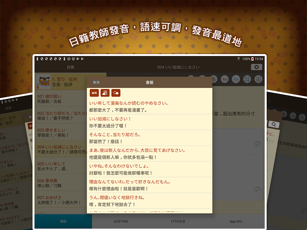 背了單詞,也學了句型,但就是無法說一口流利的日語。使用本app,您的問題可迎刃而解,輕鬆開口說道地的日語並非難事!LTTC語言訓練測驗中心精心製作,品質保證!