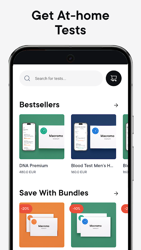 घर पर डीएनए परीक्षण, आंत माइक्रोबायोम विश्लेषण से लेकर रक्त परीक्षण तक, परीक्षणों के विस्तृत चयन को ब्राउज़ करने के लिए ऐप में हमारी दुकान पर जाएँ।