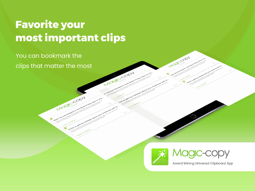 मैजिक कॉपी आपके फोन या पीसी से किसी भी टेक्स्ट या लिंक को कॉपी करना और सेकंड के भीतर अपने किसी अन्य डिवाइस में पेस्ट करना बहुत आसान बनाता है। बस अपना टेक्स्ट कॉपी करें और ऐप खोलें। टेक्स्ट/लिंक तुरंत आपके क्लिपबोर्ड में चिपका दिया जाएगा। आप किसी अन्य डिवाइस में ऐप खोल सकते हैं और अपने क्लिपबोर्ड से कुछ भी कॉपी कर सकते हैं।