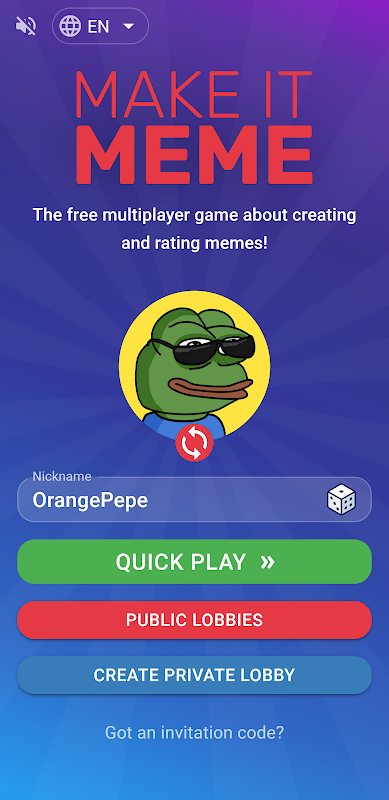 मेक इट मेमे एक मजेदार गेम है जहां आप अपने दोस्तों या असली खिलाड़ियों के साथ ऑनलाइन मेम्स बनाते और स्कोर करते हैं। बस एक लॉबी बनाएं या उसमें शामिल हों और अन्य खिलाड़ियों के शामिल होने की प्रतीक्षा करें। एक बार खेल शुरू होने के बाद, प्रत्येक खिलाड़ी को एक यादृच्छिक मेम मिलती है और दिए गए समय के भीतर एक अजीब कैप्शन के साथ आना होता है। प्रत्येक खिलाड़ी के पास इन मेम कृतियों को रेट करने के लिए 15 सेकंड का समय होता है। अंत में, सबसे अधिक अंक प्राप्त करने वाला मेम राउंड जीत जाता है। चुनने के लिए 3 गेम मोड हैं: नॉर्मल, सेम मेमे और रिलैक्स्ड। वह मोड चुनें जिसमें आप सबसे अच्छे हैं और हर किसी को अपना मजाकिया पक्ष दिखाएं! अपने पसंदीदा मेम्स को डाउनलोड करना और उन्हें अपने दोस्तों के साथ साझा करना न भूलें!