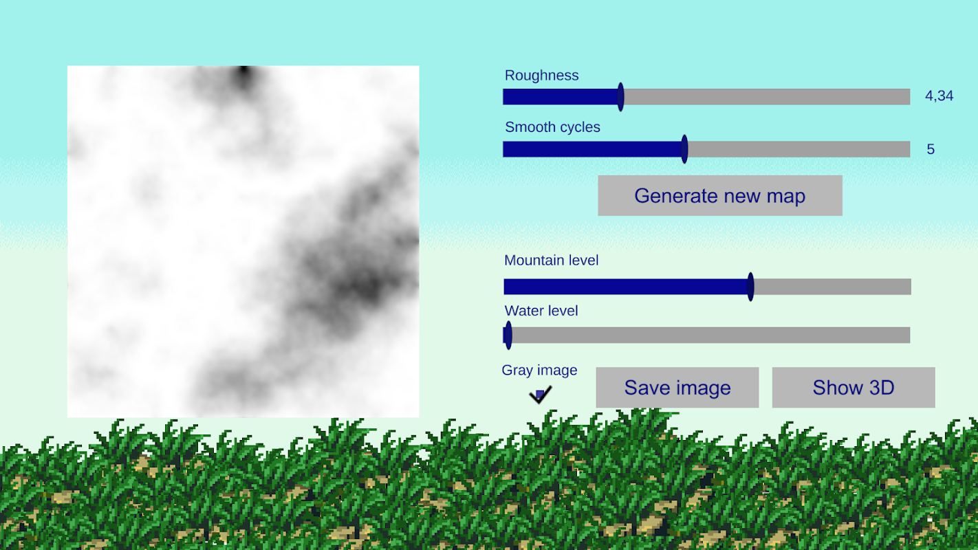 यह ऐप रैंडम हाइटमैप जेनरेट करने के लिए डायमंड-स्क्वायर एल्गोरिथम का उपयोग करता है। आप अंतिम परिणाम को प्रभावित करने के लिए खुरदरापन और चिकनी चक्र संख्या बदल सकते हैं।
