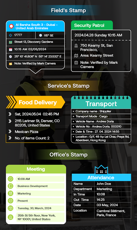 🔰Service Stamps: Perfect for tracking deliveries, tasks, and operations by capturing geotagged photos with precise timestamps and photos with location details.