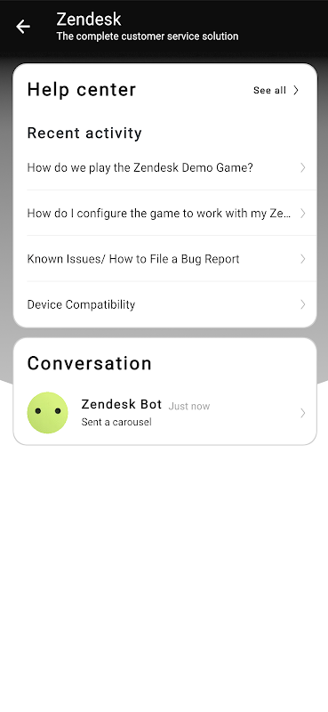 आपकी विकास टीम मिनटों में SDK स्थापित कर सकती है। यह यूनिटी के लिए मूल है, इसलिए कोई संगतता ओवरहेड नहीं है। आपके एजेंटों के पास ग्राहकों के संदर्भ और पिछले बॉट इंटरैक्शन तक पहुँच है, ताकि वे सीधे उनकी मदद कर सकें। एजेंट अपना समय अधिक जटिल कार्यों पर खर्च करते हैं जबकि Zendesk बॉट तुच्छ कार्यों को संभालते हैं।