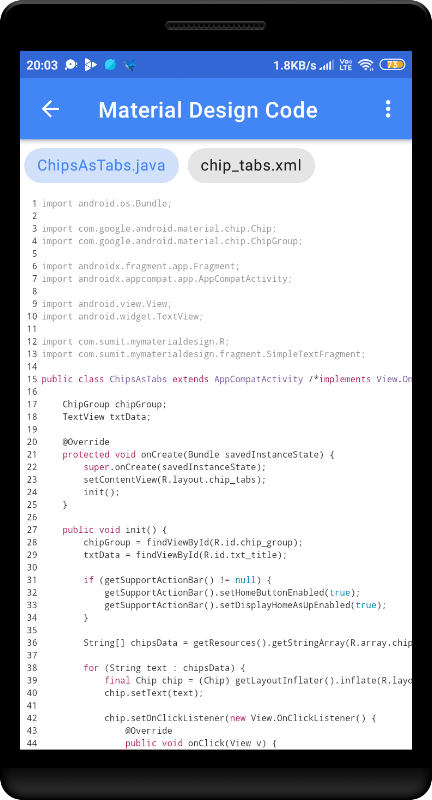 Material Components' source code snippets are available inside the app in Kotlin as well as Java programming language.