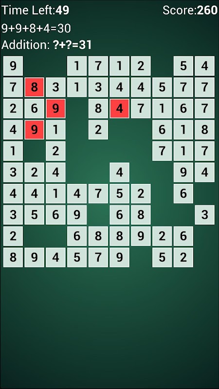 करने के लिए गणित खेलने मज़ा बस स्क्रीन से नंबर का चयन करें और उन्हें गठबंधन करने के लिए संख्या के ऊपर दिखाया समीकरण खत्म. यदि आप सही संख्या का चयन करें, चयनित संख्या स्क्रीन से गायब हो जाएगा. यदि आप गलत नंबर का चयन करते हैं, तो आप पर शुरू होगा. आप 120 सेकंड खेल खत्म करने की है. स्क्रीन पर छोड़ दिया संख्या अपने अंतिम स्कोर कम हो जाएगा.