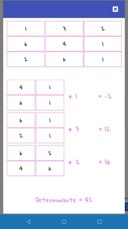 इस अद्भुत ऐप के साथ आप 2x2, 3x3 और 4x4 मैट्रिसेस के साथ बुनियादी संचालन के परिणामों को जानने और प्राप्त करने में सक्षम होंगे, इसके अलावा आप निर्धारक और इसके हस्तांतरण की गणना कर सकते हैं, आप क्या उम्मीद करते हैं? आंशिक रूप से बंद नहीं होता है आपके पास रैखिक बीजगणित में 5 होंगे