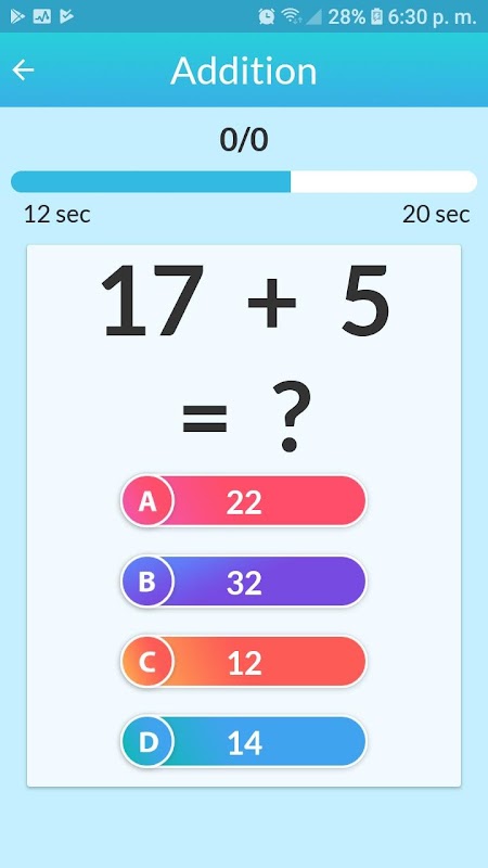 • आपसे सरल गणित के प्रश्न पूछे जाएंगे और आपको चार विकल्पों में से परिणाम का चयन करना चाहिए।