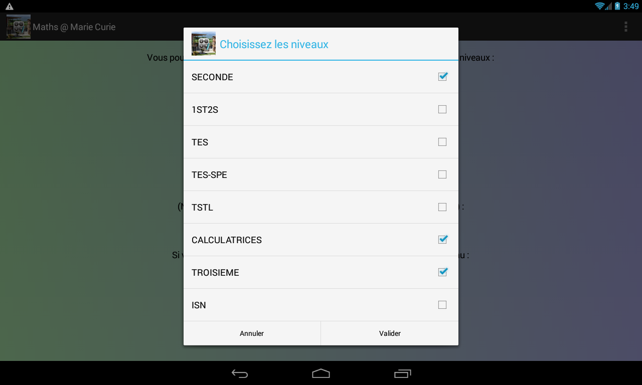 Application spécialement destinée pour mes élèves (nécessite un mot de passe) afin qu'ils puissent consulter les PDFs de cours, de correction,... directement sur leur portable ou leur tablette Android.