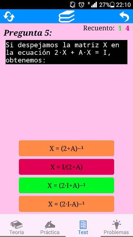 - Test: permite realizar una autoevaluación con 10 ejercicios tipo test recogidos de forma aleatoria.\n - Problemas: este apartado está destinado a la resolución de problemas, uno resuelto a modo de ejemplo y otros 5 propuestos al usuario.