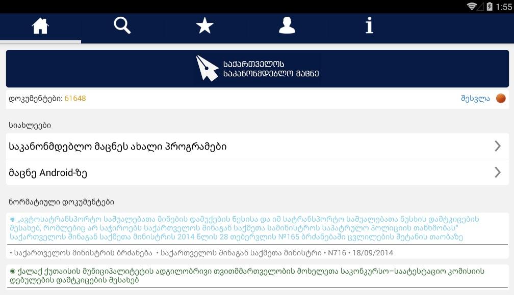 जॉर्जिया ('Matsne') की विधान हेराल्ड जॉर्जिया के न्याय मंत्रालय के शासन के भीतर सार्वजनिक कानून (LEPL) के तहत एक कानूनी इकाई है। 'Matsne' जॉर्जियाई प्राथमिक और माध्यमिक कानून के लगभग एक पूरा डेटाबेस प्रदान करता है। उपयोगकर्ता टिप्पणी करना और ऑफ़लाइन देखने के लिए पसंदीदा में दस्तावेजों को जोड़ सकते हैं भी, किसी भी स्तर पर परिवर्तन के इतिहास सहित किसी भी समेकित मानक अधिनियम का उपयोग कर सकते हैं।