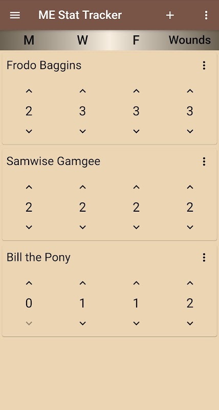 A stat tracking app for the table top wargame, Middle Earth: Strategy Battle Game, to keep track of your models' Might, Will, Fate and Wounds.