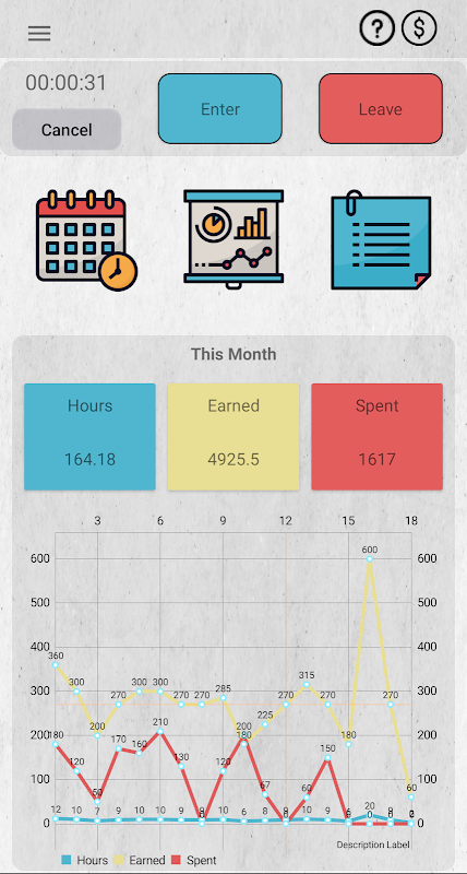 the application help you control your budget, and monitor your work hours and days , looking to the statistics and edit daily work hours , money collecting and spend.