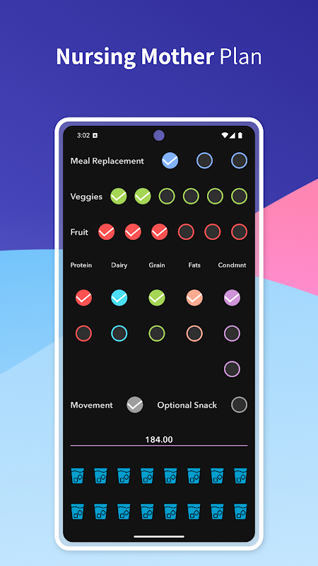 एमआर ट्रैकर सरल और उपयोग में आसान है। बस सप्ताह और दिन का चयन करें, फिर भोजन, वैकल्पिक वस्तुओं और पानी को खाते/पीते समय चिह्नित करें।