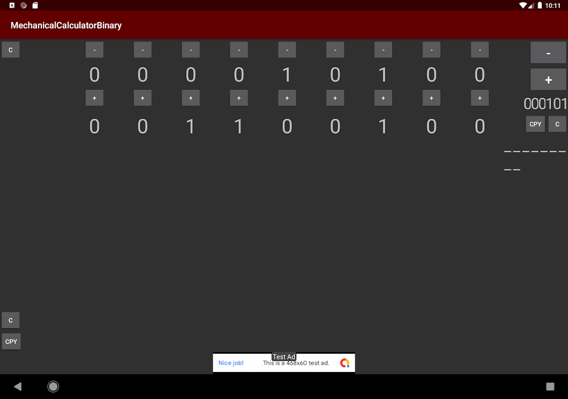 मैंने एक ऐप के रूप में मैकेनिकल कैलकुलेटर को पुन: पेश किया और बाइनरी नंबर के लिए इसका उपयोग करने की कोशिश की।