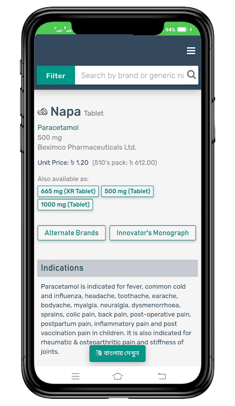 14. प्रत्येक दवा का नाम, ब्रांड नाम, वजन इकाई, कीमत, वैकल्पिक ब्रांड और विस्तृत दवा की जानकारी इन ऐप्स के माध्यम से अंग्रेजी से बंगाली में बहुत आसानी से देखी जा सकती है।