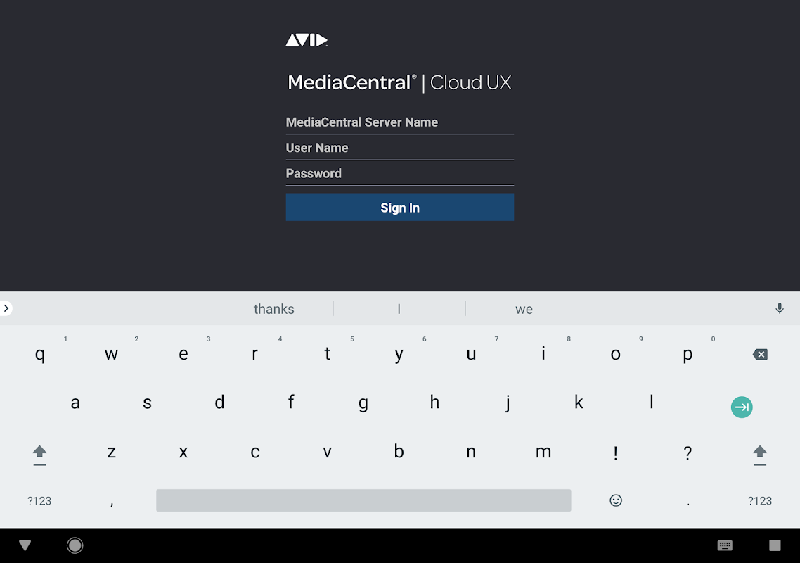 MediaCentral | Cloud UX on your Android device requires connectivity to MediaCentral. Your organization might require a VPN connection to access your system remotely. If you have issues connecting the MediaCentral | Cloud UX mobile app to your base server, or if you would like to add the MediaCentral | Cloud UX mobile app to your Avid environment, please contact your system administrator.