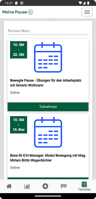 कंपनी के आंतरिक स्वास्थ्य प्रबंधन के हिस्से के रूप में AOK PLUS के कर्मचारियों के लिए डिजिटल प्रोग्राम Meine Pause निःशुल्क उपलब्ध है। इसे रोजमर्रा के काम में स्वस्थ अल्प विराम के लिए प्रेरणा के स्रोत के रूप में समझा जाना चाहिए और यह शारीरिक और मानसिक स्वास्थ्य में योगदान देता है। उपयोग स्वैच्छिक है।