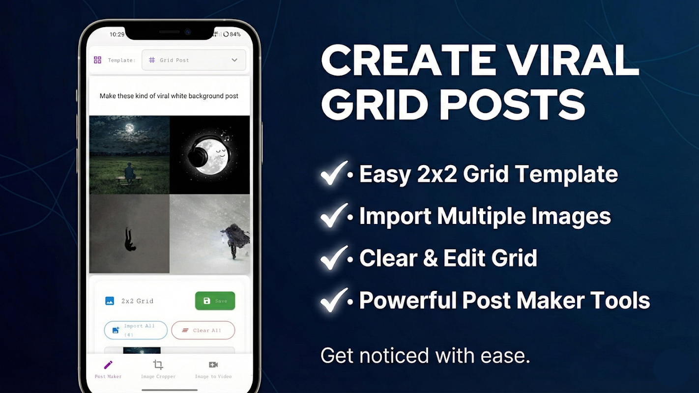 क्विकपोस्ट सोशल मीडिया के लिए आपका ऑल-इन-वन कंटेंट क्रिएशन टूल है। खूबसूरत पोस्ट डिज़ाइन करें, एक साथ कई इमेज क्रॉप करें, और आकर्षक वीडियो बनाएँ - और ये सब ऐप से बाहर निकले बिना।