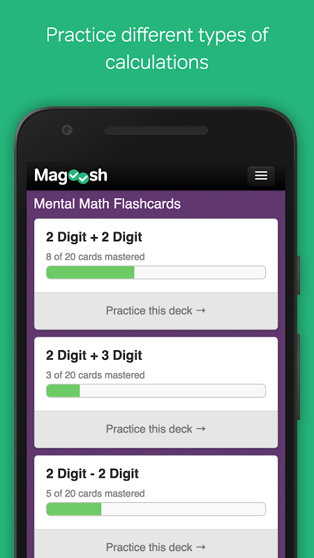 इस एप्लिकेशन को आप Magoosh की मानसिक गणित अभ्यास के लिए स्वतंत्र पहुँच https://gre.magoosh.com/flashcards/mental-math में ऑनलाइन देता है। एक Magoosh खाते के साथ साइन इन (या एक नया बना) वेब के लिए अपनी प्रगति को बचाने के लिए।