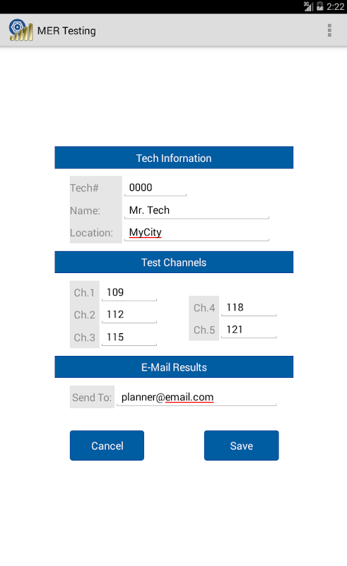 जबकि एक नल पर मेर परीक्षण के परिणाम रिकॉर्ड करने के लिए इस एप्लिकेशन का उपयोग करें। सेटिंग्स स्क्रीन आप पीडीएफ प्रारूप में परिणामों को भेजने के लिए अपने टेक नंबर, नाम, स्थान और 5 टेस्ट चैनल, साथ ही एक ईमेल पते को सेट करने की अनुमति देता है।
