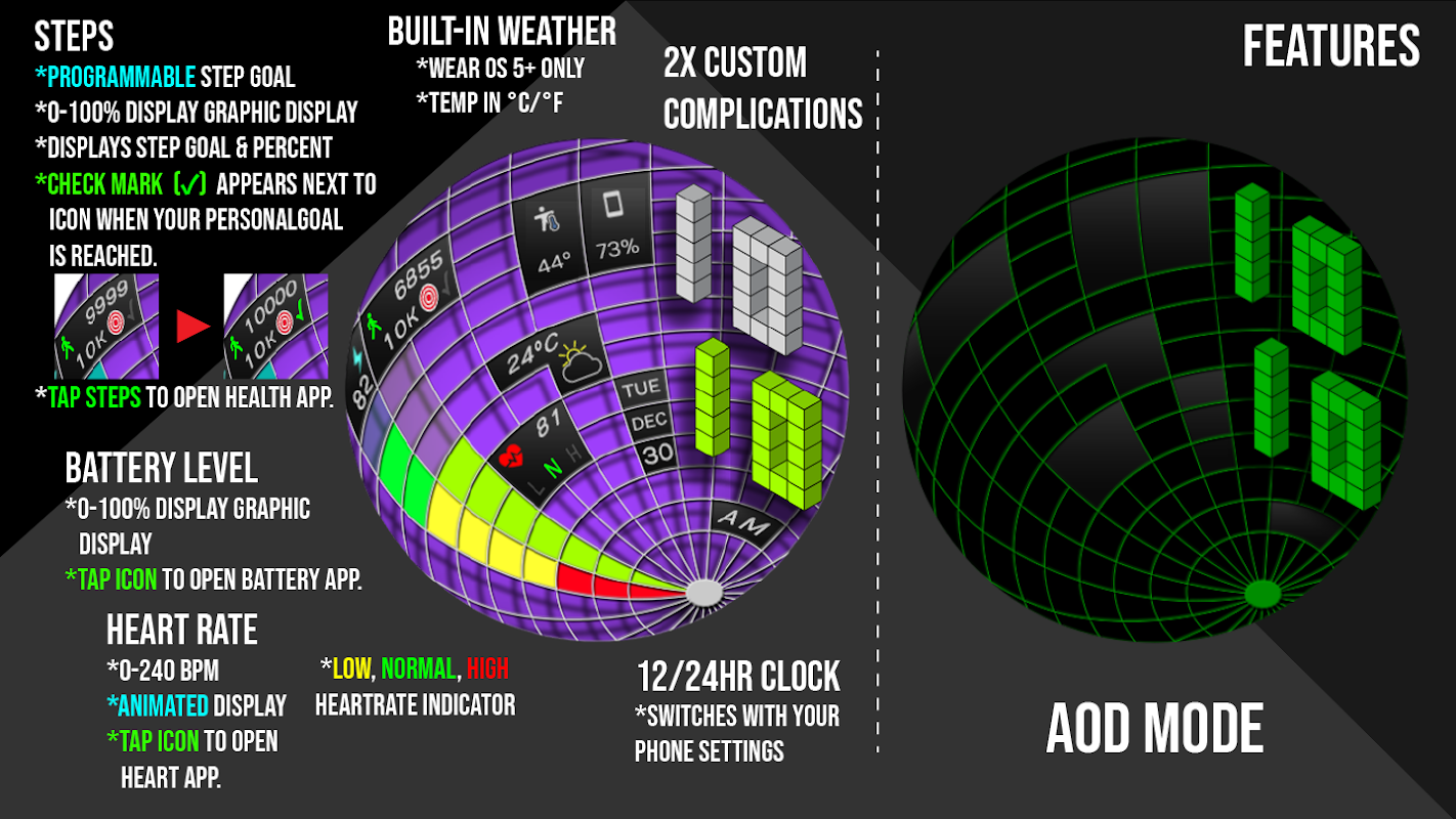 * बिल्ट इन वेदर जो आपके वॉच/फ़ोन पर इंस्टॉल किए गए आपके वेदर ऐप से मौसम डेटा प्रदर्शित करता है। प्रदर्शित डेटा में तापमान, उच्च और निम्न तापमान, कस्टम वेदर आइकन और स्क्रॉलिंग वेदर कंडीशन शामिल हैं।
