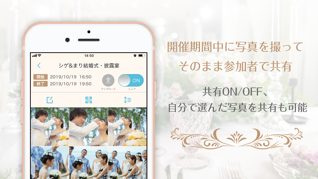 結婚式のイベントを作成することで、簡単に設定した時間内に撮影した写真の共有が可能です。
