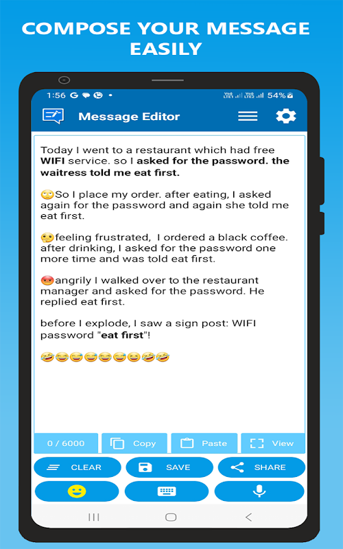 यदि आप एक विश्वसनीय संदेश टेक्स्ट संपादक ऐप खोज रहे हैं, तो संदेश संपादक प्रीमियम ऐप आपकी आदर्श पसंद है। यह ऐप आपको संदेशों को सहजता से लिखने, संपादित करने और साझा करने में मदद करने के लिए एक सरल, सहज उपयोगकर्ता इंटरफ़ेस प्रदान करता है।