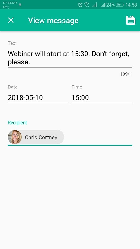 The program is designed for scheduling SMS sending at expected time. The application silently assists you and won't bother when you have limited time. On message creation you set date and time when the system has to send it. The scheduler can be useful either you're going to deliver birthday greetings in several days or you intend to remind some of your colleagues to do important things tomorrow morning.