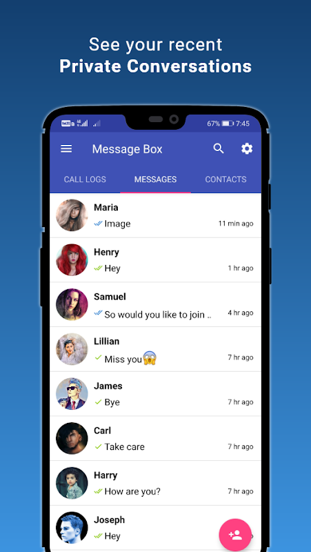 To keep your conversation secret for any private number, add it as Private Contact. After that, when any new message received from that contact, it directly move inside secure text box. It's easy to use and keeps user chat secret. Your SMS conversation is 100% SECRET and secure.