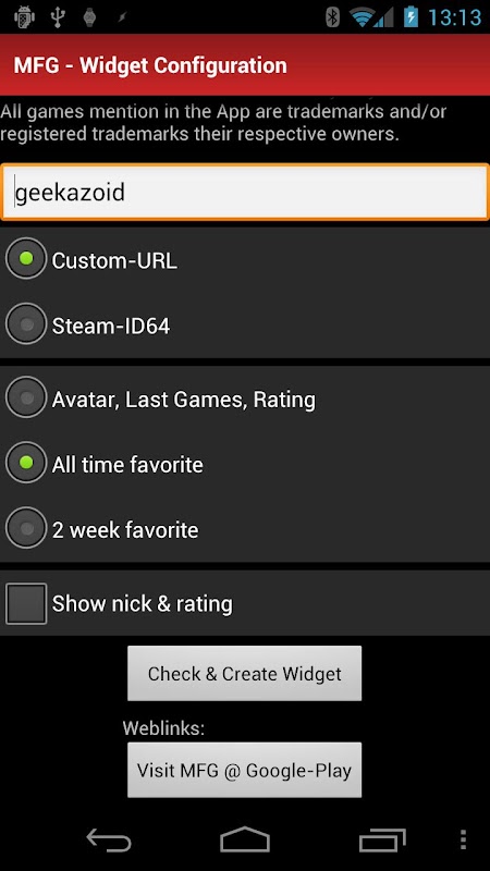 MFG for Steam is a set of widget for your Android device to show information about your Steam account.