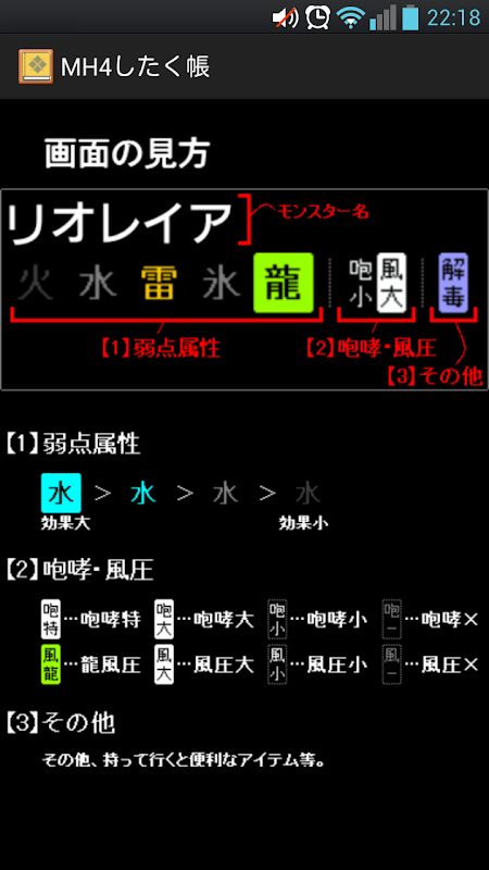 MH4(モンスターハンター4) 出現モンスターの弱点属性をすばやく確認できるアプリです。