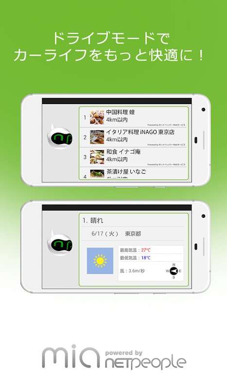 ドライブモードを搭載!ハンドルを握ったまま、欲しい情報を音声でゲット!アシスタントのかわいい女の子“mia”が、対話を通して必要な情報を絞り込んで教えます。