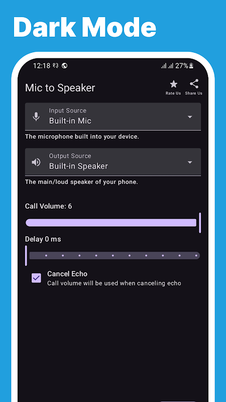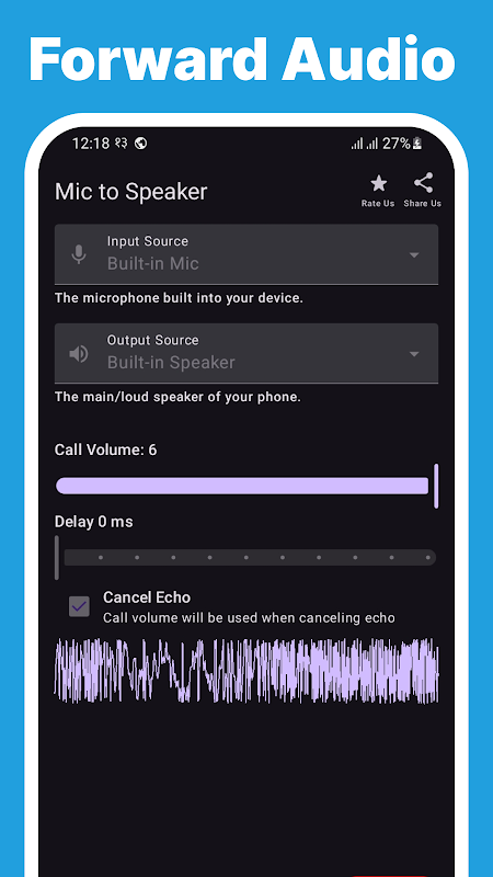 यह ऐप आपको अपने फोन के माइक्रोफोन (माइक) से स्पीकर और बाहरी ब्लूटूथ स्पीकर तक ध्वनि रूट करने की सुविधा देता है। आप इको रद्दीकरण सक्षम कर सकते हैं.