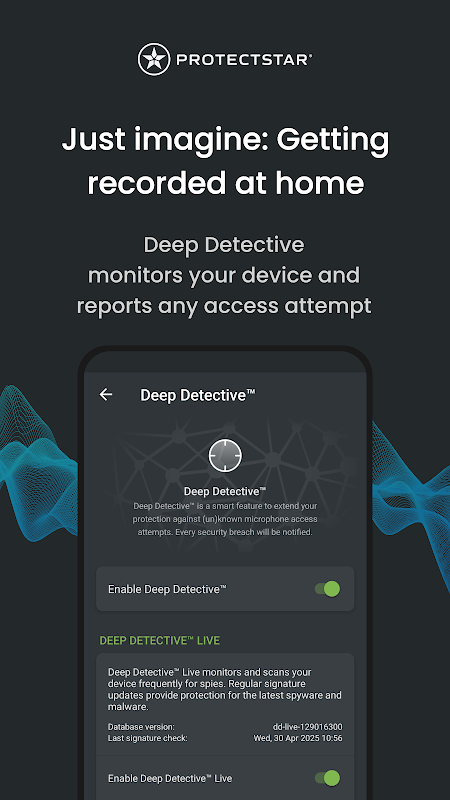 फ़्री edition से Micro Guard PRO में upgrade करें और subscription लेकर Deep Detective™ Live को unlock करें – एक real‑time anti‑spyware scanner जो stalkerware और spyware को detect करने के लिए बनाया गया है जो आपके माइक्रोफोन तक पहुँचने की कोशिश करते हैं। Live spyware scanner heuristics और signature database का उपयोग करता है ताकि ज्ञात और नए threats की पहचान करने में मदद मिल सके।