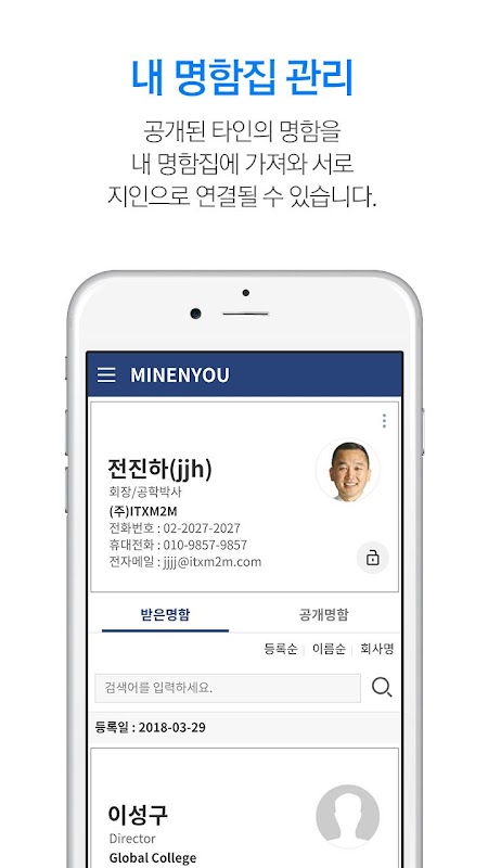 - 공개된 타인의 명함을 내 명함집에 가져와 서로 지인으로 연결될 수 있습니다.