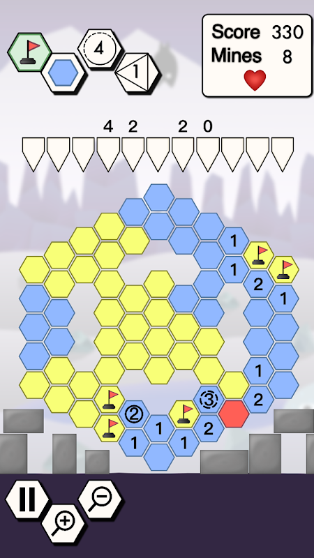 ● Mine sweep through levels contain hexagon cells and others with square cells which adds variety to the puzzles.