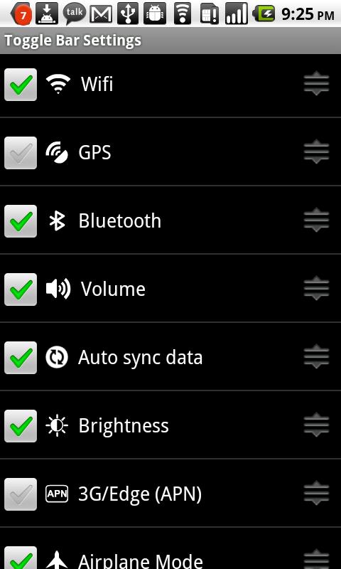 - 11 टॉगल के साथ टॉगल बार: वाईफाई, जीपीएस, ब्लूटूथ (बीटी), खंड, चमक, हवाई जहाज मोड, स्क्रीन मध्यांतर, APN (3 जी जीएसएम धार), अनलॉक प्रतिमान, ऑटो रोटेशन, ऑटो सिंक