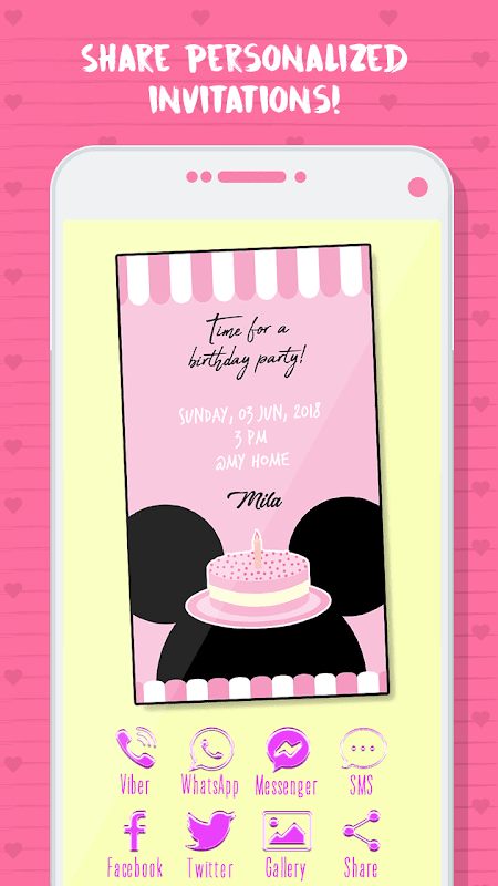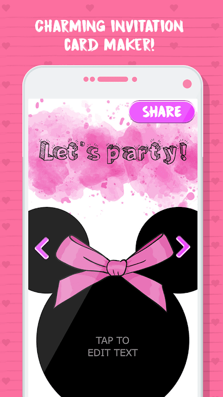 अद्भुत उपहार कार्ड बनाने के लिए लड़कियों के लिए जन्मदिन की पार्टी के लिए निमंत्रण निर्माता का प्रयोग करें! minni विषय से प्रेरित सुंदर निमंत्रण के साथ सामान्य जन्मदिन पार्टी निमंत्रण कार्ड बदलें! इलेक्ट्रॉनिक शादी के निमंत्रण आपके कार्यक्रम को बहुत लालित्य देंगे। -🎀जन्मदिन निमंत्रण - निमंत्रण निर्माता👸- पार्टी को मज़ेदार और आसान बनाने की योजना बनायेगा! शादी के लिए निमंत्रण कार्ड निर्माता मुफ्त में अपनी पसंद का जन्मदिन कार्ड तैयार करें!