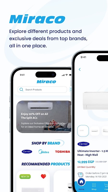 आधिकारिक MIRACO ऐप के साथ आराम और सुविधा का अनुभव करें, यह दुनिया के दो प्रमुख ब्रांडों: कैरियर और मिडिया से आवासीय एयर कंडीशनिंग समाधानों की पूरी श्रृंखला के लिए आपका डिजिटल गेटवे है। चाहे आप अपने घर के कूलिंग सिस्टम को अपग्रेड कर रहे हों या अपनी पहली AC यूनिट खरीद रहे हों, MIRACO ऐप आपके स्मार्टफ़ोन से ब्राउज़ करना, तुलना करना और खरीदना पहले से कहीं ज़्यादा आसान बना देता है।