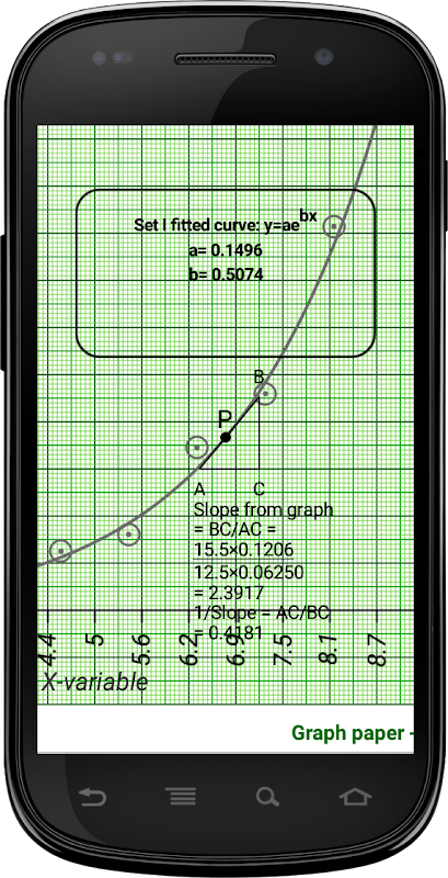 * फिट किए गए घटता पर किसी भी बिंदु पर ढलान की गणना करें, जैसे आप प्रयोगशाला में एक स्केल और एक पेंसिल का उपयोग करके एक वास्तविक मिमी-विभाजन ग्राफ पेपर पर करेंगे।