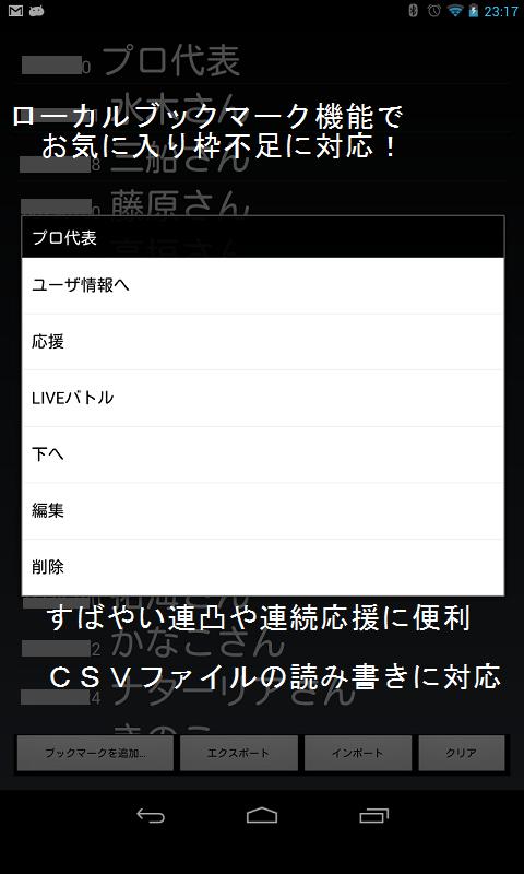 -स्थानीय बुकमार्क फ़ंक्शन जो स्थानीय रूप से उपयोगकर्ताओं की सूची सहेजता है। सरल उत्तलता और जयकार करना आसान होगा। चूंकि सीएसवी फाइलों को आयात/निर्यात किया जा सकता है, संपादक या पीसी के साथ सूची संपादन आसान है।
