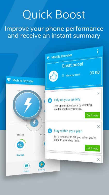 • QUICK BOOST – improves and provides an instant summary on your phone’s performance with a one tap boost