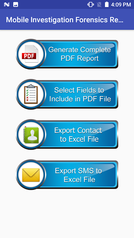 नि: शुल्क एप्लिकेशन की जांच करने और एक व्यावसायिक फोरेंसिक जांच विशेषज्ञों की तरह अपने मोबाइल फोन या अन्य Android सेल फोन उपकरणों का विश्लेषण और अपने मोबाइल सामग्री के बारे में विस्तृत रिपोर्ट तैयार करने के लिए। यह हमारे पिछले अनुप्रयोग के समर्थक संस्करण है और एक्सेल बैकअप और अग्रिम आइटम चयन आदि डाटा डॉक्टर मोबाइल जांच एप्लिकेशन स्कैन की अतिरिक्त सुविधा है और अपने सेल फोन पढ़ता है और निम्नलिखित मानकों की रिपोर्ट तैयार करता है: