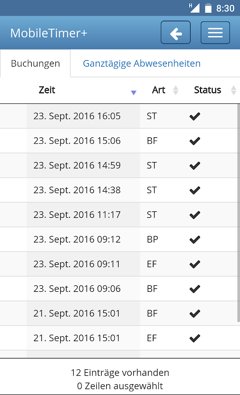 - Alle Zeitstempel können als Daten im csv.-Format per Email exportiert und dann mit einem beliebigen Zeitmanagementsystem weiter verarbeitet werden.