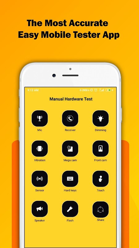 Also, MobiTest can test your device components such as Display, Multitouch, Flashlight, Loudspeaker, Ear Speaker, Microphone, Ear Proximity, Light Sensor, Accelerometer, Vibration, WiFi, Bluetooth, Fingerprint, Volume Up Button, Volume Down Button.