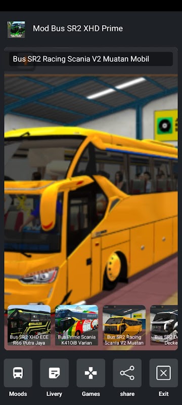 SR2 XHD प्राइम मॉड में, कई डाउनलोड करने योग्य मॉड हैं जैसे SR2 पैनोरमा बुसिड मॉड, साथ ही SR2 XHD स्कैनिया K410IB संस्करण. हम SR2 XHD ECE R66 पुत्रा जया ट्रांस संस्करण भी उपलब्ध कराते हैं, तथा Busid SR2 XHD प्राइम स्कैनिया K410iB सुमात्रा संस्करण को भी नहीं भूलते, जो इस एप्लीकेशन में एक मुख्य आकर्षण है. एसआर2 बस मॉड का विवरण अतिरिक्त एसआर3 सिंगल ग्लास बस मॉड सुविधाओं के बराबर है.