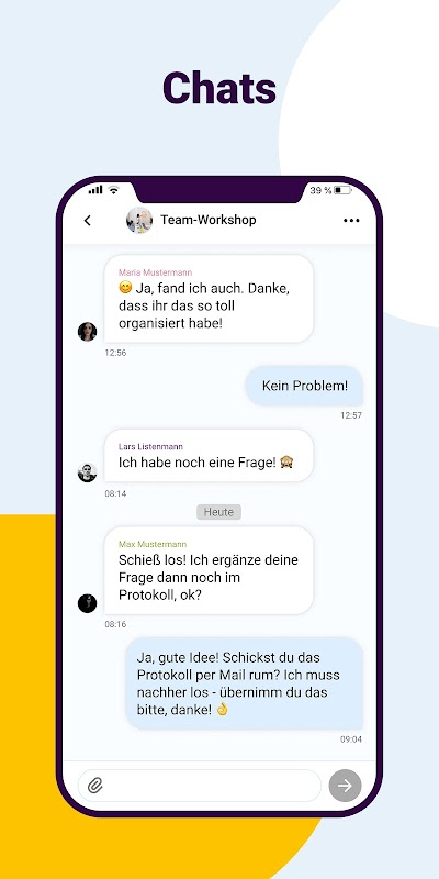हैलो! आसान है। सहज उपयोगकर्ता मार्गदर्शन बिना किसी आईटी ज्ञान के उपयोगकर्ताओं को मोइन के साथ बिना किसी समस्या के ऐसा करने में सक्षम बनाता है! शुरू करने के लिए। सादगी के अलावा, सुरक्षा पर ध्यान केंद्रित किया जाता है, क्योंकि प्रसिद्ध अमेरिकी चैट टूल के विपरीत, मोइन से डेटा! जर्मनी में आईएसओ प्रमाणित सर्वर पर।