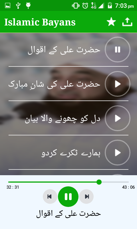 This application contains huge islamic data i.e Quran Tilawat, Read Quran, Listen Naat, Audio bayans, Qawali, Islamic nasheed and Quran with Translations.