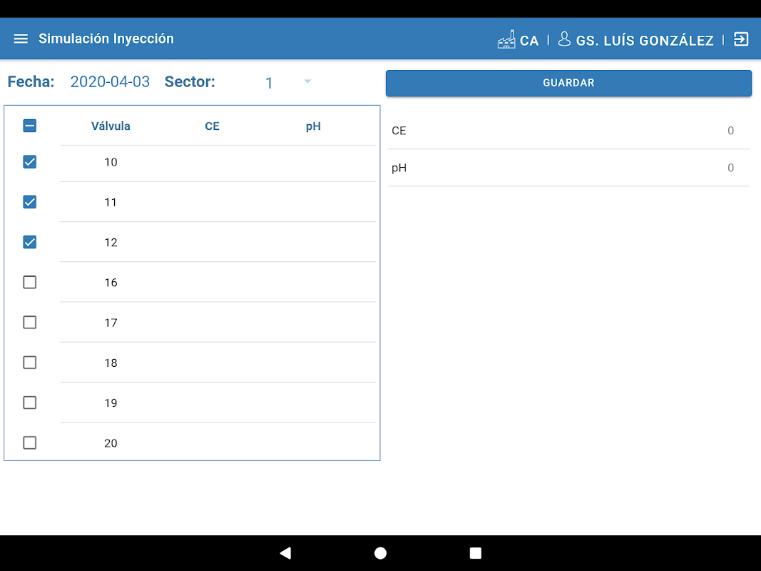 APP SEM. Cuenta con funcionalidades inicialmente de sincronización de información proveniente de planos de siembra, después de realizar el inicio de sesión correspondiente para ingresar a la aplicación, se va a visualizar la información referente a los bloques existentes según la finca, por cada bloque se encuentran las válvulas pertenecientes al bloque. Y de acuerdo con la selección de la válvula, se puede visualizar tipo de flor, tipo de cama y se podrá ingresar la fecha del monitoreo.