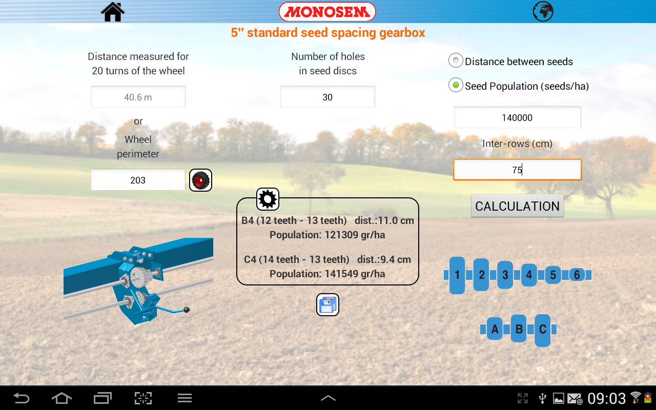 समायोजन किया और बागान विशेषताओं (बोने की मशीन और गियरबॉक्स, अंतर पंक्ति रिक्ति और डिस्क पर छेद की संख्या का मॉडल) दिया एक बार, उपयोगकर्ता सिर्फ जानना (जनसंख्या / हेक्टेयर या बीज के बीच की दूरी) आवश्यक बीज आबादी इंगित करने के लिए है उचित गियरबॉक्स अनुपात. आवेदन आवश्यक समायोजन या ऊपरी या निचले अनुपात आवश्यक समायोजन करने के लिए पास के लिए बिल्कुल इसी अनुपात का प्रस्ताव है.